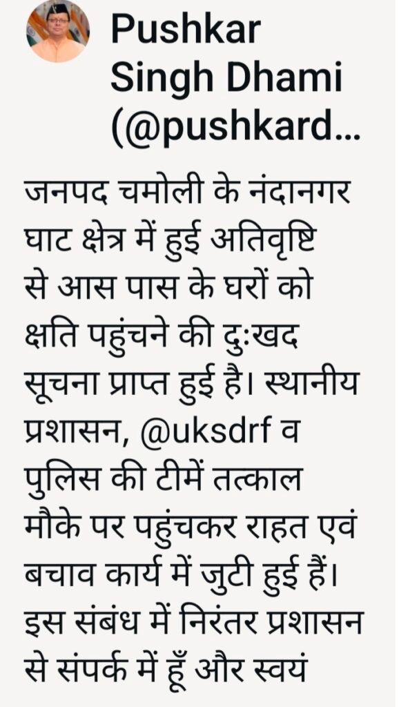 dehradun, जनपद चमोली के नंदानगर में 17 सितम्बर की रात फिर आई आपदा. जिससे जानमाल का भारी नुकसान हुआ है। अकेले नंदानगर में 5 लोगों के लापता होने की खबर है. जबकि, 2 घायल बताए जा रहे हैं। इसको लेकर CM पुष्कर सिंह धामी ने दुख जताया है.