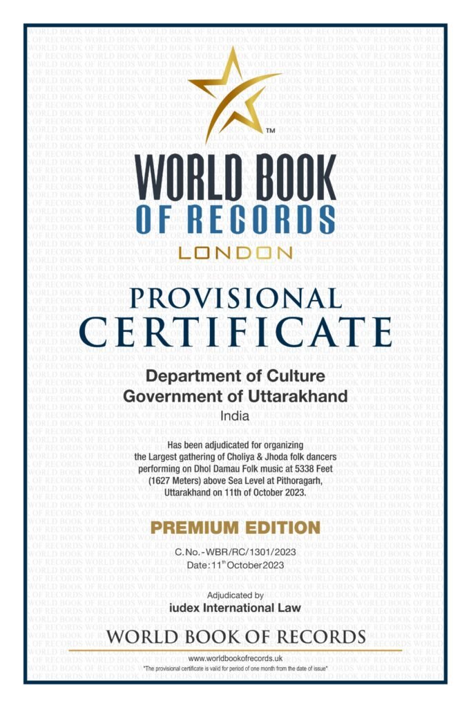 Dehradun, प्रधानमंत्री श्री नरेन्द्र मोदी के 12 अक्टूबर को देवभूमि उत्तराखण्ड आगमन पर उत्तराखण्ड के छोलिया और झौडा लोक नृतकों की ढोल दमाऊँ लोक वाद्यों के साथ प्रस्तुति को वर्ल्ड बुक ऑफ रिकार्ड में स्थान प्राप्त हुआ है। यह जानकारी देते हुये निदेशक संस्कृति विभाग द्वारा बताया गया है कि सीमान्त जनपद पिथौरागढ़ में समुद्र तल से 5338 फीट (1627) मीटर की आश्चर्यजनक ऊँचाई पर एक अनोखा और ऐतिहासिक कार्यक्रम संस्कृति विभाग, उत्तराखण्ड द्वारा आयोजित किया गया। उत्तराखण्ड के इतिहास में पहला कार्यक्रम था जिसमें जनपद पिथौरागढ़ के सुदूरवर्ती अंचलों से छोलिया एवं झौड़ा नृत्यक दल के लगभग 3000 लोक कलाकारों द्वारा अपनी पारम्परिक वेश-भूषा एवं लोक गीतों के माध्यम से विश्व का ध्यान उत्तराखण्ड की ऐतिहासिक एवं समृद्धशाली लोक सांस्कृतिक विरासत की ओर आकर्षित किया हिमालय के हृदय सीमान्त जनपद पिथौरागढ़ में एक असाधारण एवं अभूतपूर्व घटना दुनिया को देखने को मिली।